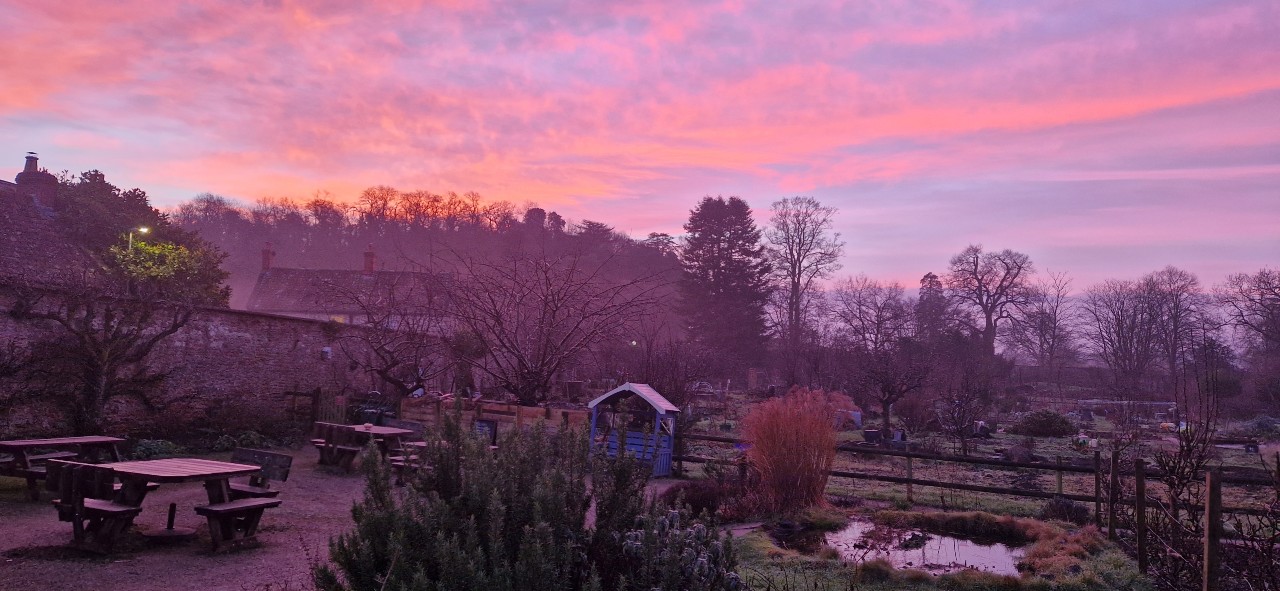 February is the month for our Winter Borders to shine, they are such a cheerful splash of colour and structural interest even on the dullest, coldest days. If you visit you will be rewarded with beautiful, bright dogwood ‘Midwinter Fire’ with shades of red, orange and yellow. The dogwood ‘Pallida’ is bright yellow and underplanted with Hellebore ‘Harringtons Pink’ and Carex grass looks stunning.. Providing it does not dry out the witch hazel can be grown in a large pot. The dogwoods do require more space at the back of a border. I have attached a picture of the new winter border behind the Wells border and a beautiful early morning pink sky in the Community Garden last month.